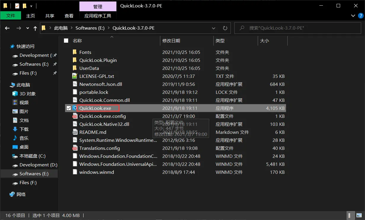 [Windows] QuickLook插件 OfficeViewer V6 1.情景展示QuickLook软件,在不打开文件的前提下,可以快速预览文件内容; 2.下载及安装下载地址:GitHub-QuickLook ![]() 红框位置,将会显示最新版本 点击:Latest,来到对应版本下载页; ![]() 提供了两种版本 一种是:安装版(.msi格式); 我用的是免安装版的; ![]() 解压,双击运行QuickLook.exe即可启动使用; ![]() 在桌面右下角,我们可以选择:启动是自动运行(也就是开机启动) ![]() 3.插件下载便携版预装插件有: ![]() 也可以点击上图当中的“获取新插件”,打开下载地址。 4.插件安装选中已经下载好的插件,按空格键,将会出现安装弹窗; ![]() 点击“安装此插件”; ![]() 出现这个提示,就安装成功啦,重启QuickLook即可(退出,然后重新打开)。 ![]() 具体报错信息在你的QuickLook安装子目录下: E:\QuickLook-3.7.0-PE\UserData\QuickLook.Exception.log ![]() 会被记录在QuickLook.Exception.log中 5.插件卸载由于我这个是便携版的,所以,手动安装的插件会被统一安装在: E:\QuickLook-3.7.0-PE\UserData\QuickLook.Plugin 将不需要的插件,目录,按delete键删除即可。 题外话 ![]() 里面的文件就是实现预览的必须文件。 插件原址:https://github.com/QL-Win/QuickLook/wiki/Available-Plugins 软件原址:https://github.com/QL-Win/QuickLook/releases 各版本 常用插件 打包分流: 百度:https://pan.baidu.com/s/1pMjU3O3wb4WesiSUTdAlnA?pwd=52pj 提取码: 52pj 夸克:https://pan.quark.cn/s/8a577aeae031?pwd=96w5 提取码:96w5 迅雷:https://pan.xunlei.com/s/VOhNRf6xlJK4AKD0AUhgrYa5A1?pwd=qfs6# 插件安装方法:选中已经下载好的插件,按空格键,将会出现安装弹窗,点击“安装此插件” 该文章在 2025/12/31 16:36:03 编辑过 |