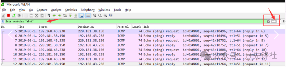 后面条件表达式就需要自己填写。如下我想过滤出data数据包中包含"abcd"内容的数据流。包含的关键词是contains 后面跟上内容。