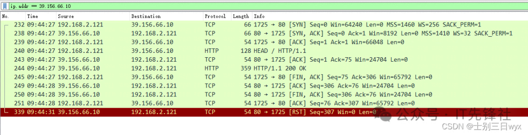 - 3. 第三个包是第三次挥手,百度(39.156.66.10)向我(192.168.2.121)发送一个FIN+ACK,表示这是一个释放连接的请求