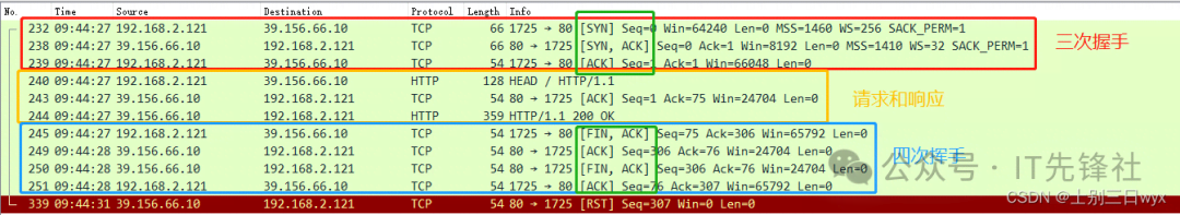 1)先看前三个包,HTTP是基于TCP的,需要先通过「三次握手」建立连接