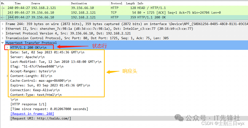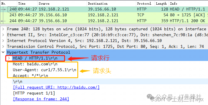 - 2. 第三个包是,百度(39.156.66.10)向我(192.168.2.121)发送了一个「HTTP响应」,响应状态码是 200 OK