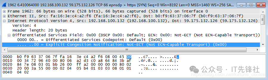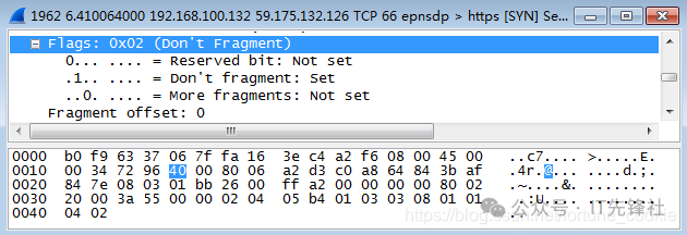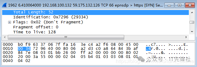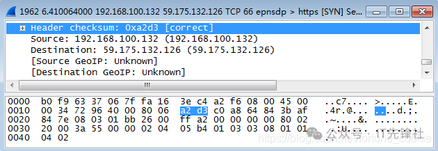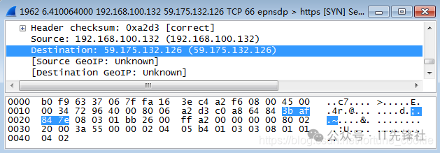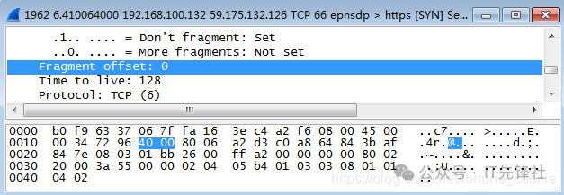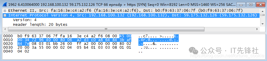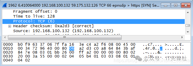 双击点击一条tcp报文进入详细信息,那为什么不选Protocol类型为IP的协议呢? 答案是没有,tcp报文正是基于ip协议的,tcp是传输层协议,而ip是它底下的网络层协议。 第四步,分析IP数据包,根据图中的数据帧格式,分析IP包的各部分。
