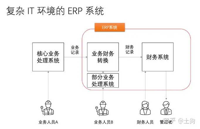 第一,业务人员在系统里处理核心业务,例如制造企业的采购、生产、库存、销售等活动 或者物流企业的接单、运输、仓储、派单、收款等活动,或者人力资源外包服务公司的签约、订单、履约、开票、清账等活动。