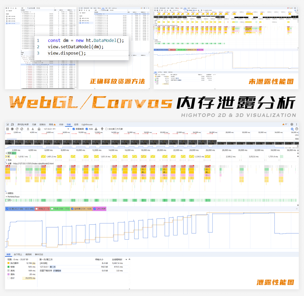 从上图可见,blink_gc 占用 4GB 内存,这可能并非内存泄漏,而是 Blink 的 Oilpan GC 策略导致的正常现象。其核心机制是内存池化 (Memory Pooling):Blink 会预先向操作系统申请大块的连续内存区域。页面中几乎所有的 Blink C++ 对象(包括大量临时的字符串、数组等)都在这个大内存池中进行分配,以提升效率。 当这些短生命周期的对象不再被引用时,它们在逻辑上被视为“垃圾”,但它们所占用的物理内存并不会立即归还给操作系统。GC 回收器会根据当前的内存压力 (Memory Pressure) 来决定何时执行彻底的清理。 在本案例中,机器总内存高达 64GB,资源充裕,Chrome 判断无需迫切回收。为避免不必要的性能开销(一次完整的 GC 会消耗 CPU 资源),GC 选择推迟回收操作。因此,我们看到的 4GB 占用,实际上是 Oilpan GC 持有的一个较大的内存池,其中包含了活动对象和大量待回收的“垃圾”对象。只要这个内存池的大小趋于稳定,没有出现持续、无节制的增长,通常就不构成内存泄漏问题。 HT 与内存泄露综合上述的三部分内容,我们捋清了内存泄漏问题的主要原因,并掌握了对应的排查方法。而在 HT 框架中,内存泄漏的问题在 3D 场景中最为常见,由于 HT 的 3D 是基于 WebGL 实现的,此类泄漏往往会表现得尤为明显。 为了清晰呈现 HT 3D 中的内存泄漏问题,我们设计了一个简单的对照实现来进行演示。 对照实验 在展开实验前,我们先简要了解下 HT 框架的核心架构。HT 采用 MV 架构模式,在 HT 的框架设计中, Data 模型和 View 视图是分离的,二者之间通过 Event 事件监听和派发机制来建立起数据绑定。 在实验操作前,我们可以打开 Chrome DevTools -> Performance (性能) 面板,并且点击面板中的录制按钮,记录整个实验过程,这能帮助我们在操作结束后,回溯并分析全程性能和内存的变化情况。 实验环境: 浏览器:Chrome 138.0.7204.101(64位) 显卡:NVIDIA GeForce GTX 1660 Ti 处理器:Intel(R) Core(TM) i5-10400F CPU @ 2.90GHz (2.90 GHz) 第一次实验 我们通过按钮不断创建新的视图,当页面中超过一定数量Graph3dView 时,可以看到第一个场景“崩溃”,但是当我们删除最后一个 Graph3dView 后,第一个场景又恢复了。 我们可以从 Performance 面板中观察到整个过程: