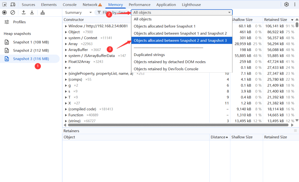 1、使用对比视图 在完成以上的操作步骤后,选择第三个快照,并在顶部的视图选择器中(下图 ②),将视图模式从 Summary 切换为 Comparison,比较对象选择为快照 2(下图 ③)。现在视图只会显示快照 2 和快照 3 之间发生变化的对象。操作后需要关注以下内容: