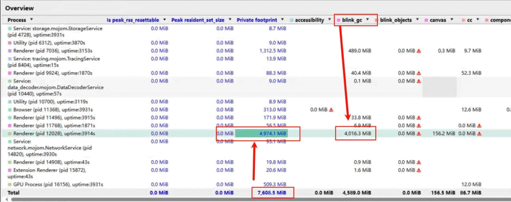 一个标准的 WebGL 资源生命周期应遵循“创建-绑定-使用-解绑-删除”的模式。GPU 显存泄漏并非浏览器的“缺陷”,而是开发者未能遵守这一显式契约的结果。 HT 中的 graph3dView 提供了专门的 dispose 方法,当 3D 场景确定要释放的时候,主动调用 g3d.dispose() 将会彻底把当前的所有跟 WebGL 相关的 GPU 资源彻底释放。 查看这类资源占用,通常需要观察系统显卡的显存使用情况。以 Windows 系统为例,可以通过:「任务管理器 → 性能 → GPU → 专用 GPU 内存」这一路径,直观地看到显存占用的变化趋势。以一个 6G 显存的 GPU 为例,尽量将显存占用控制在合理范围(譬如 5G 以内,避免超过 5.5G),否则一旦超标,系统可能会强制回收显存资源。 原生堆:理解 Blink 的 Oilpan GC分析完应用层的内存问题,我们的视线将最终聚焦于浏览器的 C++ 底层核心 ——Blink 渲染引擎。 Blink Oilpan GC 是 Chromium 浏览器引擎 Blink 中用于管理 C++ 对象内存的垃圾回收 (Garbage Collection, GC) 系统。Oilpan 采用的是一种先进的并发标记与增-量清除 (Concurrent Marking and Incremental Sweeping) 垃圾回收机制。这种机制的核心思想是尽可能地将垃圾回收的工作与主线程 (main thread) 的任务(例如 JavaScript 执行、页面布局和渲染)并行处理,从而最大限度地减少因 GC 而导致的页面卡顿 (jank)。 通常这块内存由 Blink 底层管理,Web 应用层是无法干预的,这里我们通过一个实际案例来展开说明:JS 堆快照显示其 24 小时动画运行后内存增长微乎其微,但 Windows 资源监视器却显示 Chrome 进程占用了 4GB 内存。这种悬殊的差距,让人不禁好奇。