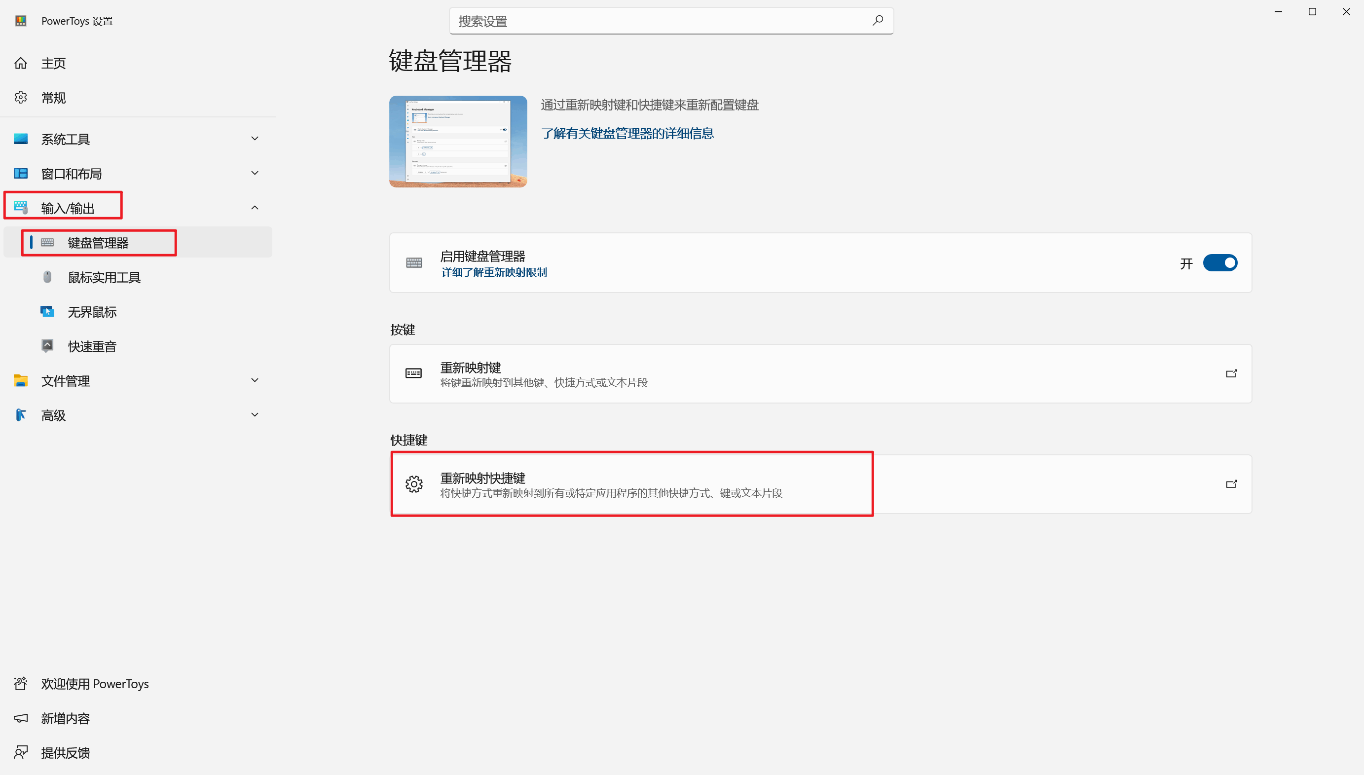 通常更习惯使用Windows系统自带的Win + D组合快捷键实现快速返回桌面,因此还可以使用Microsoft PowerToys的快捷键映射功能将Windows系统自身的Win + D映射为ShowDesktopOneMonitor的Win + Shift + D。