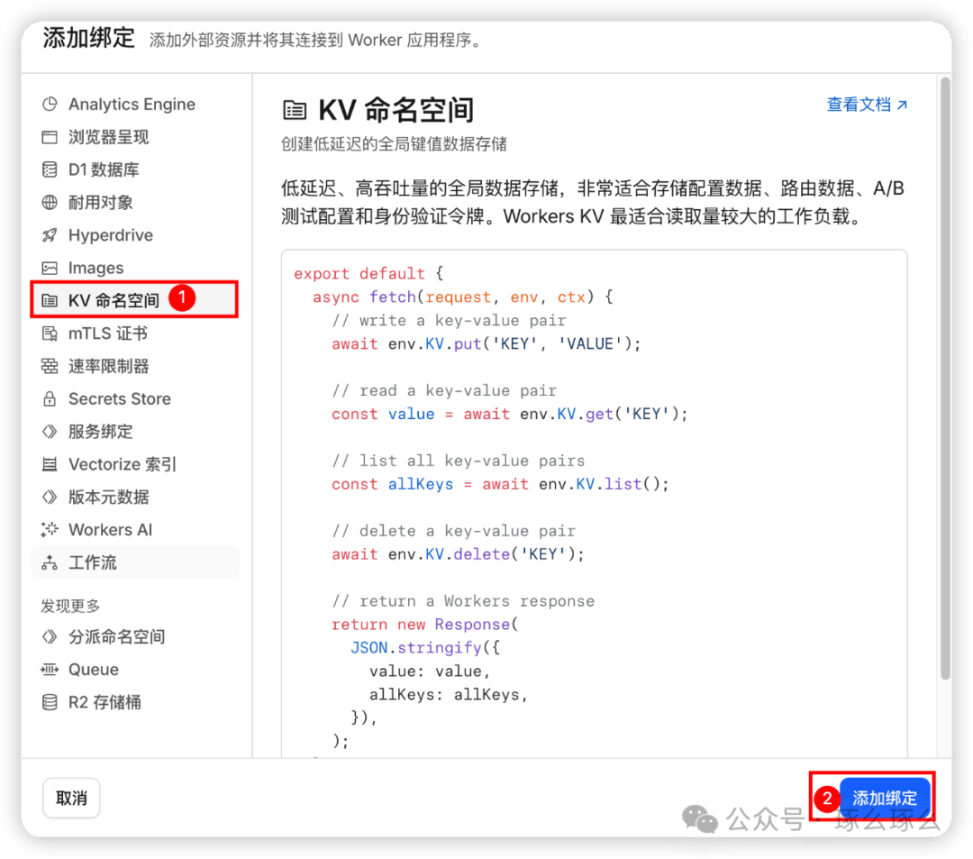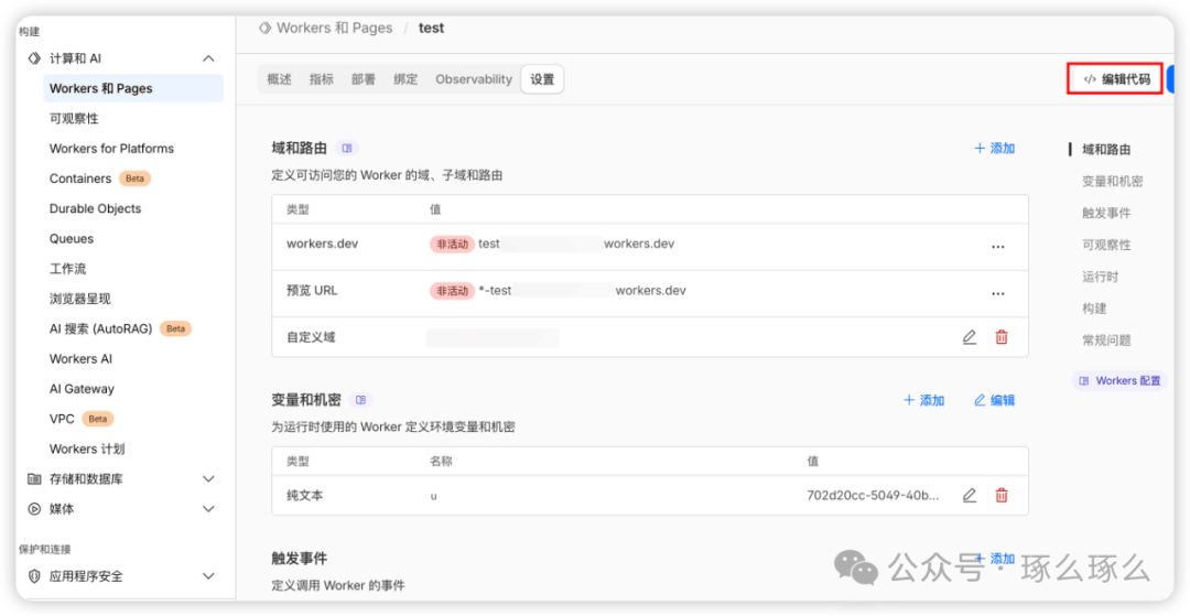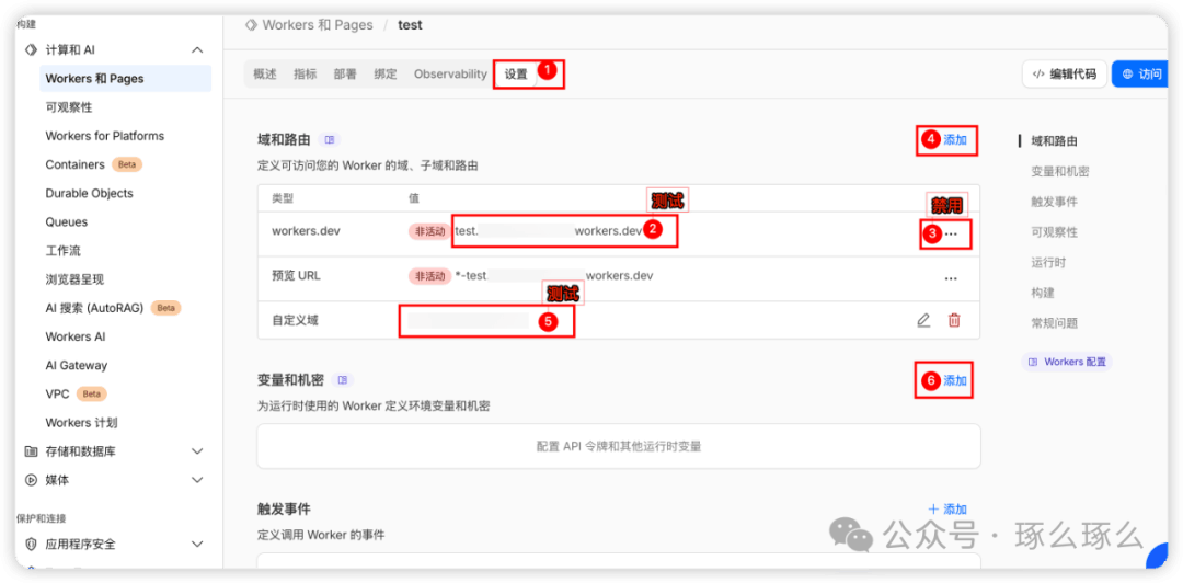 AI时代使用Claude、Chatgpt、Codex、Gemini、Copilt必备!一家提供网络服务和基础设施的全球性科技公司。早期以内容分发网络和分布式域名解析服务闻名。目前产品线非常广泛,包括CDN、DDoS防护、DNS服务、WAF-Web应用防火墙、SSL/TLS加密、边缘计算。Cloudflare采用了一种独特的反向代理模式,能够在网站和访客之间处理流量、提供安全和加速服务。目前免费计划产品线主要提供核心的CDN加速、基础DDoS防护和免费SSL证书,对个人和小型网站非常友好。还提供Cloudflare Workers:一个无服务器计算平台,让开发者可以在Cloudflare的边缘节点上运行代码。2.【Workers 和 Pages】下创建workers这里请注意,最好一个cloudflare账户创建一个Workers,因为免费用户很有可能遇到资源不够的情况,配置多个workers会导致功能不可用回到刚刚创建的Workers页面,绑定新创建的KV【设置】Workers(1),先测试worders.dev链接(2)是否可以正常访问,再禁用域(3),然后【添加】域和路由(4),选择【自定义域】,可以绑定自己的个人域名,免费域名申请请参考【免费域名申请】