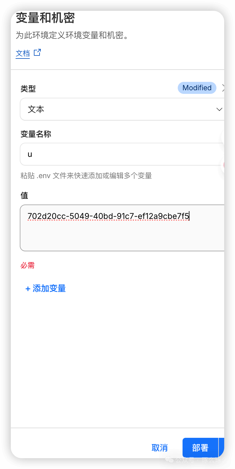 这里需要注意,添加的自定义域名最好是顶级域名,尽量不要使用子域名,因为cloudflare可能不会识别子域名或者视子域名为别人域名而导致回调不成功,不能正确使用功能。域和路由添加完成后,要测试域名(5)是否可以正确显示Hello World!选择文本类型,设置变量名称和值,值是uuid,可以使用在线生成一个,这里的uuid要记住,后面运行时要使用。添加完成后部署。首先将worker.js的代码清空,使用部署代码替换。我使用的是一款开源项目代码,具备IP优选和代理功能,使用动态的UUID。https://github.com/byJoey/cfnew