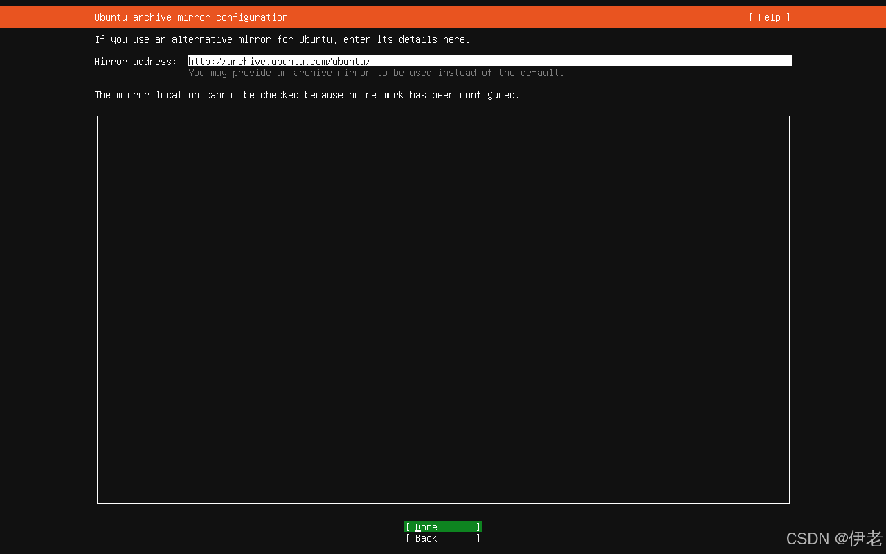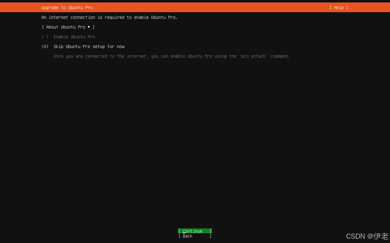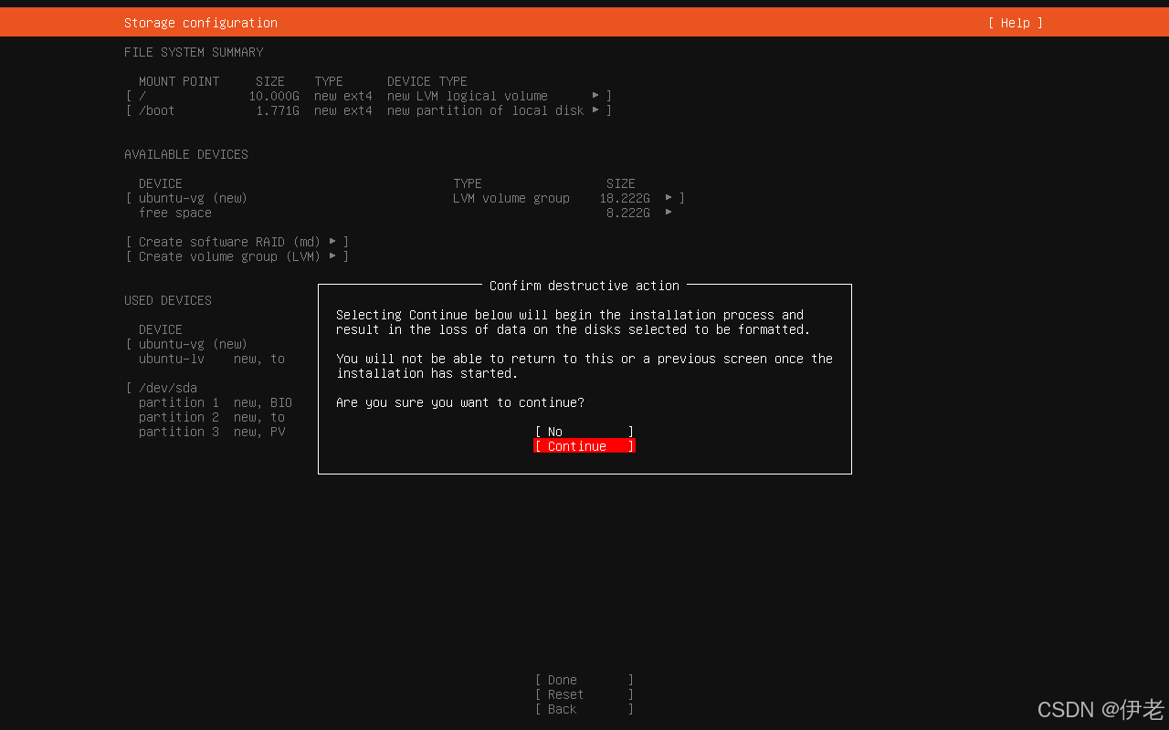 弹窗提示开始安装后,无法回到前边的配置页面,直接选择继续。 →「Continue」→ 回车;