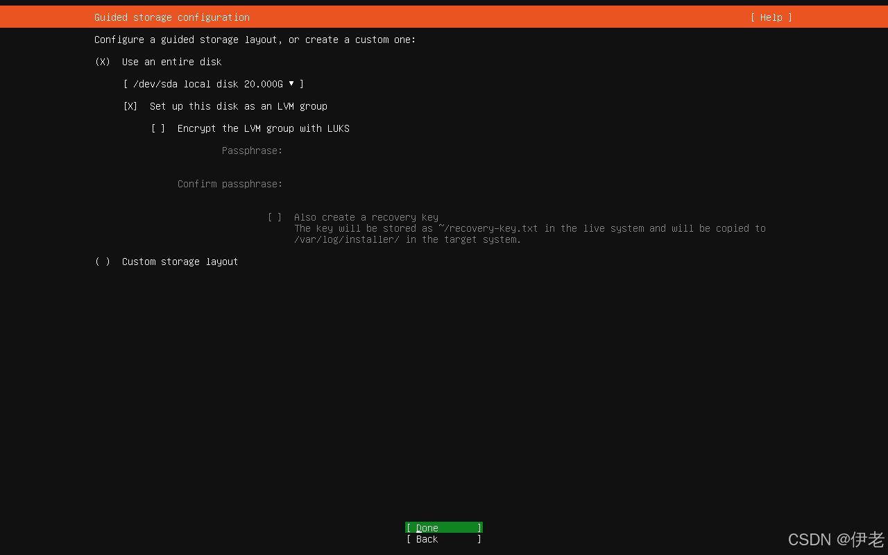 「Use an entire disk」(LVM管理磁盘) 「Done」→ 回车;