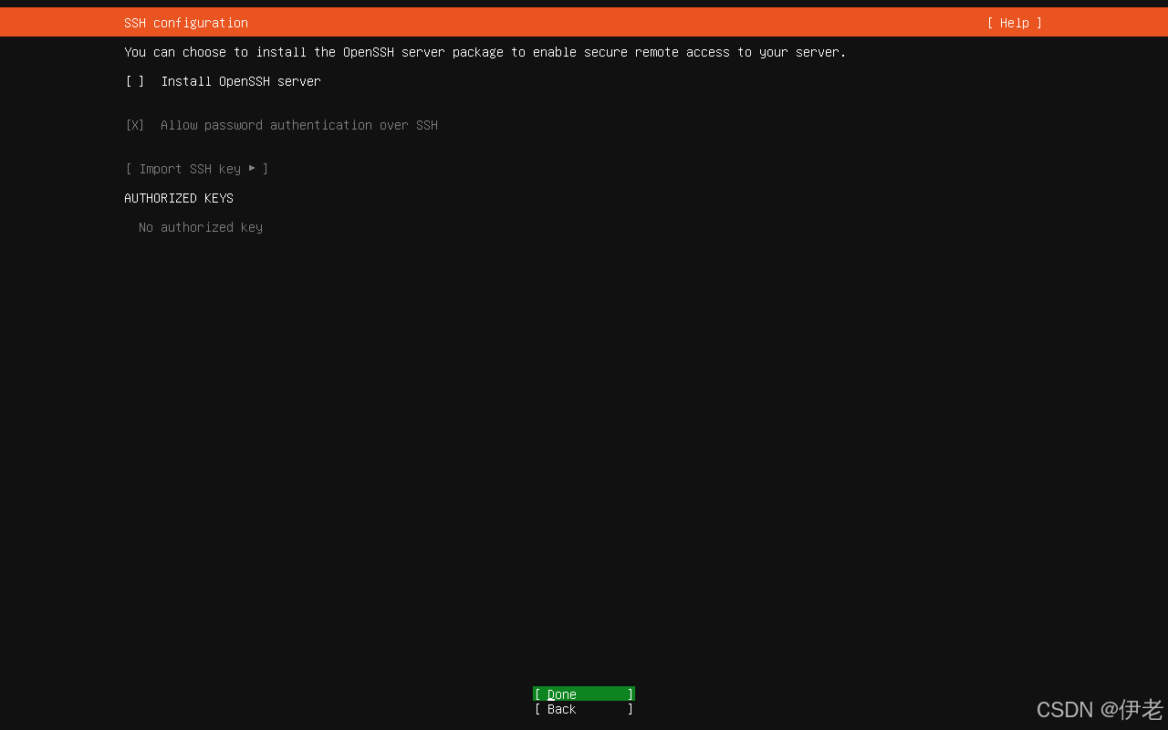 取消勾选「Install OpenSSH server」(系统安装完成后手动安装)「Done」→ 回车;