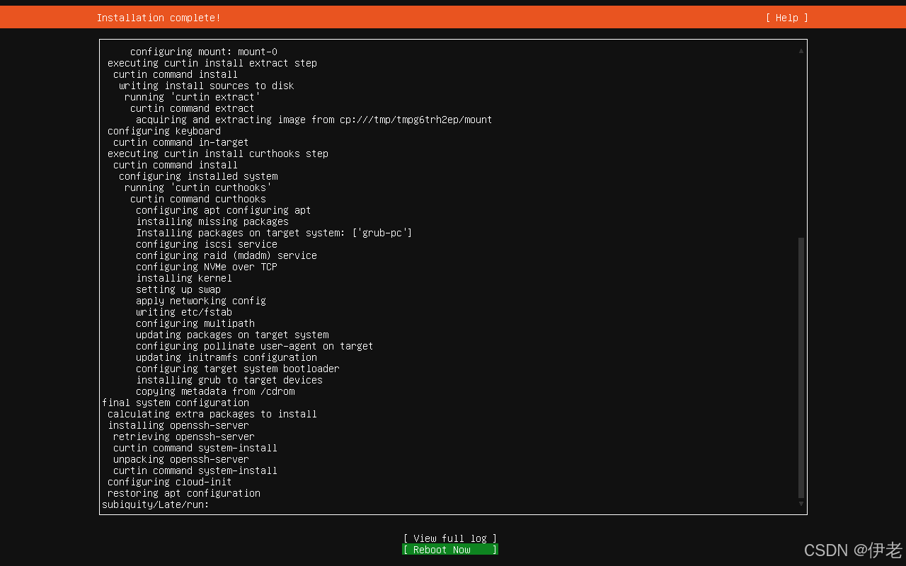 安装过程会自动完成「文件复制→系统配置→软件安装」,期间无需操作,完成后会提示「重启」,点击「Reboot Now」。
