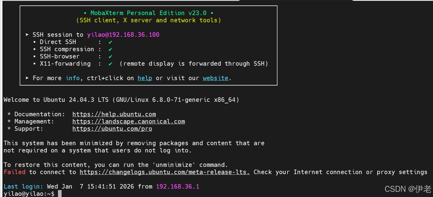最小化 Ubuntu 上边步骤未预装openssh-server,需通过apt安装,这是 SSH 连接的核心依赖。