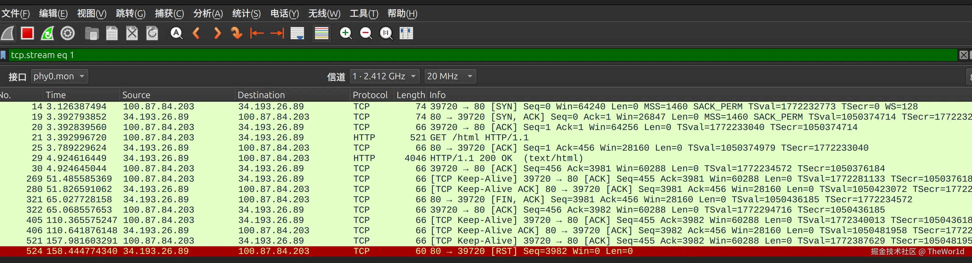 此时我们的面板变成了这样,自动过滤:tcp.stream eq 1