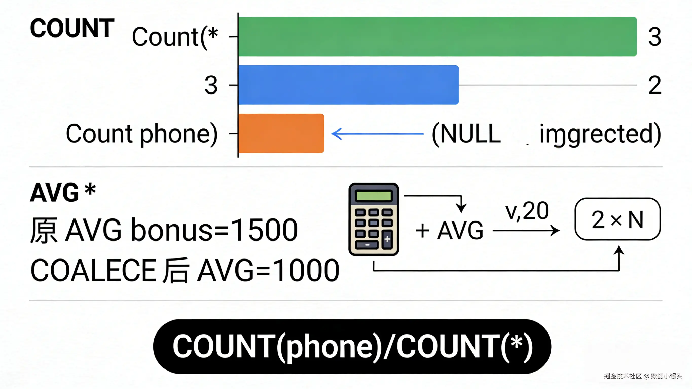 实战场景: 计算“用户手机号填写的覆盖率”。 应使用 COUNT(phone) / COUNT(*),而不是直接看行数。 2. 平均值的陷阱AVG()、SUM()、MAX() 等聚合函数在计算时,会自动忽略 NULL 值。 场景复现: 某部门 3 个人,奖金分别是:1000, 2000, NULL(未发)。 老板问:平均奖金是多少?