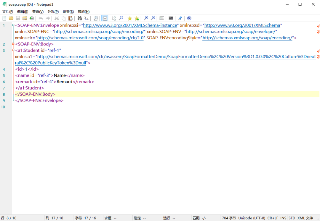 var file = "D:\\soap.soap";Student student = new Student();student.Id = 1;student.Name = "Name";student.Remark = "Remard";SaveAsSOAPFile(student, file);