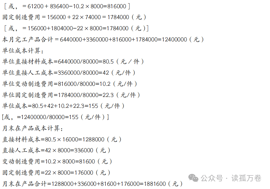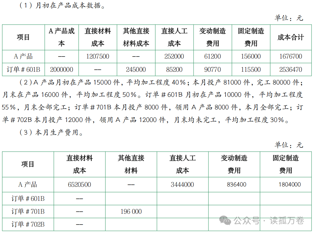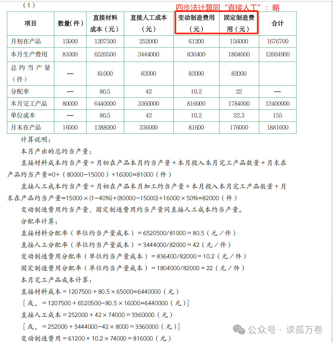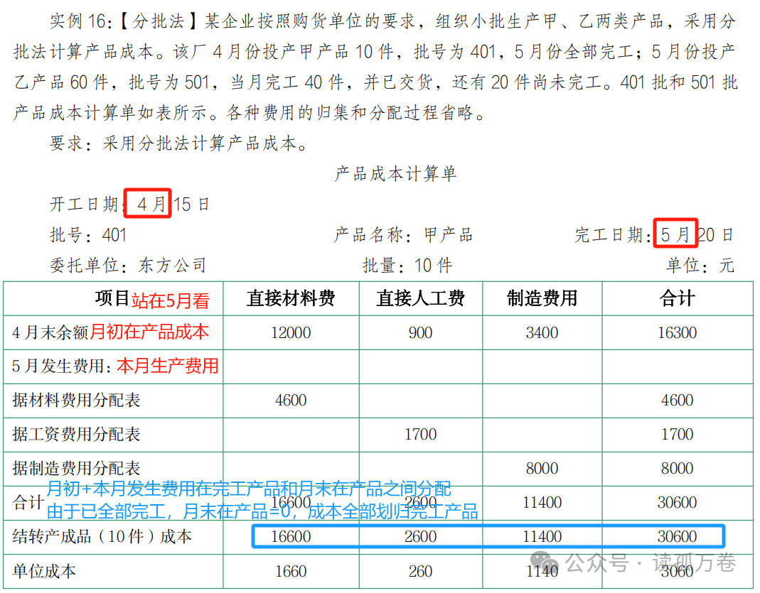 情形一:401批甲产品(标准分批法)情况:4月投产,5月全部完工。 处理:分批法标准应用。该批次5月全部完工后,将其成本计算单上归集的全部生产费用(4月末余额+5月发生费用)合计30,600元,直接全部结转为10件产成品的总成本,并计算单位成本。 特点:不存在任何在完工产品与在产品之间的费用分配问题,简单、直接。