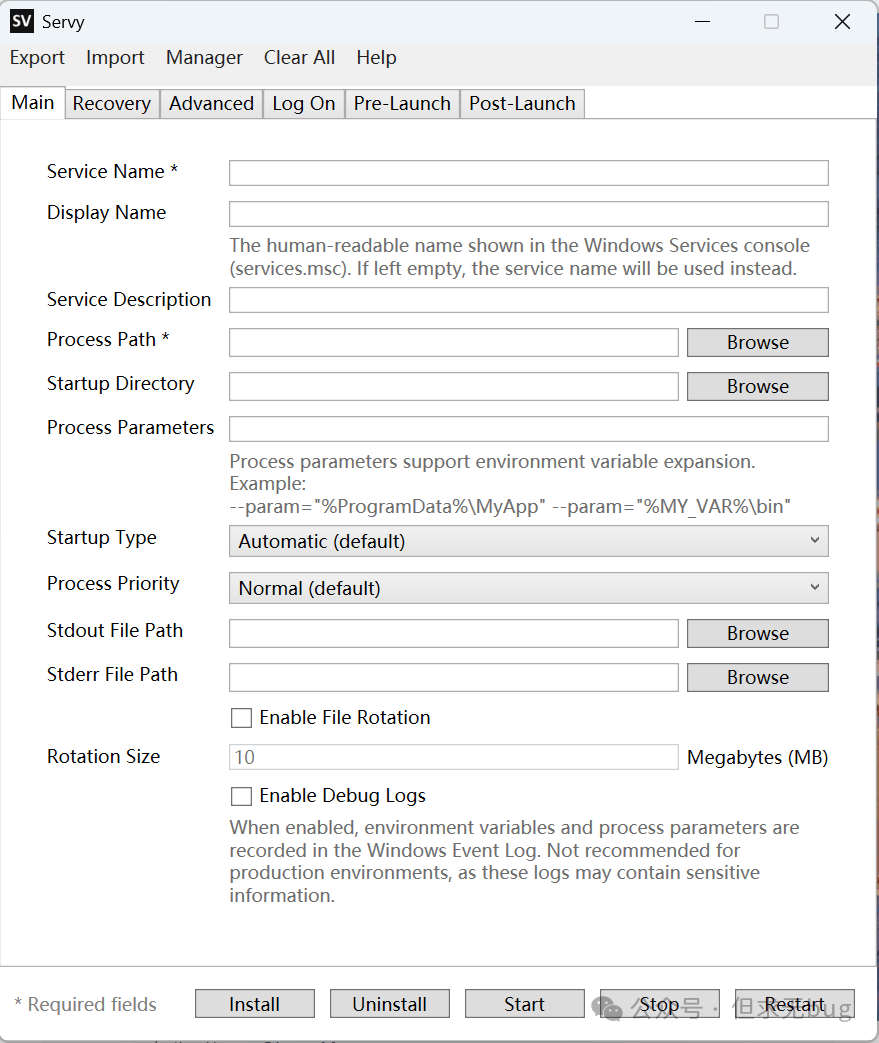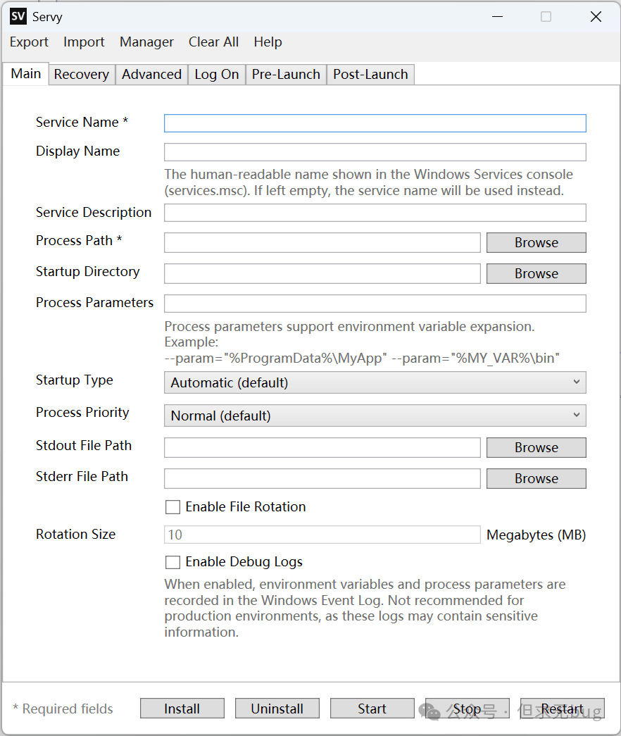 一、简介最近使用RClone 工具后,便想找一个相对完美的工具将其注册为 Windows 服务进行管理。之前虽然用过 WinSW 和 NSSM,但总感觉还不是那么完美,关键是两者都已经停更不短的时日。所以又找了许久,终于发现了这款 Servy。使用后发现基本上能满足本人需求,故分享出来供大家参考。 好了,闲言少叙,话归正题。 Servy 是一个Windows 服务管理工具,能将大部分应用程序注册成 Windows 服务进行管理。 其官网地址为:https://servy-win.github.io/ ![]() 二、下载在其官网主页点击“Download” 便会跳转到 GitHub 的 release 列表页: ![]() 从此处可知,你当前最新版本为:v3.9。这里按需选择适合自己的版本进行下载即可。我这里下载的为“servy-3.9-x64-installer.exe”,下载后如下所示: ![]() 三、安装双击刚才下载的安装程序,会弹出安全提示信息: ![]() 此时只需点击“更多信息”便能看到 "仍要运行"按钮: ![]() 点击后会弹出如下安装页面: ![]() 选择同意协议后,点击“Next”开始配置安装目录: ![]() 修改后的安装目录如下所示: ![]() 接着点击“Next”开始配置是否 ![]() 接着点击“Next”便会显示安装配置汇总信息: ![]() 接着点击“Install” 便会开始进行安装: ![]() 等待一会便会安装完毕: ![]() 此时点击“Finish”便会结束安装。若勾选了安装桌面快捷方式,则会在桌面生成两个快捷图标:Servy 和 Servy Manager。 ![]() 其中,Servy 用于填写注册服务的相关配置和注册服务,而 Servy Manager 则是用于管理已安装的服务。两者打开后分别如下所示: