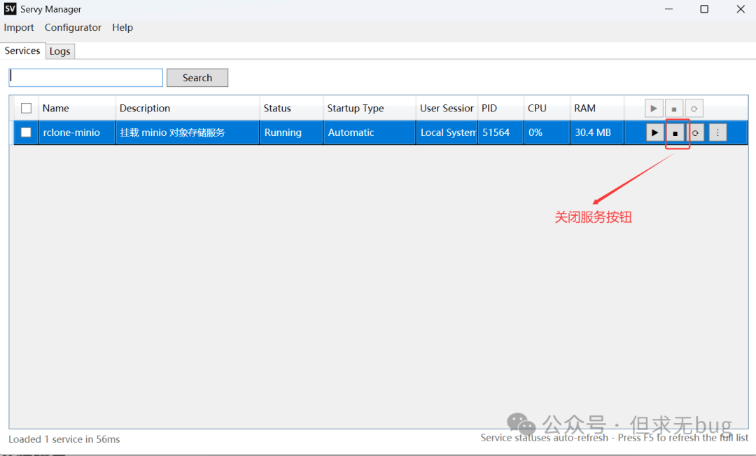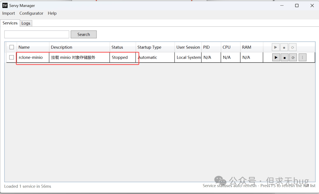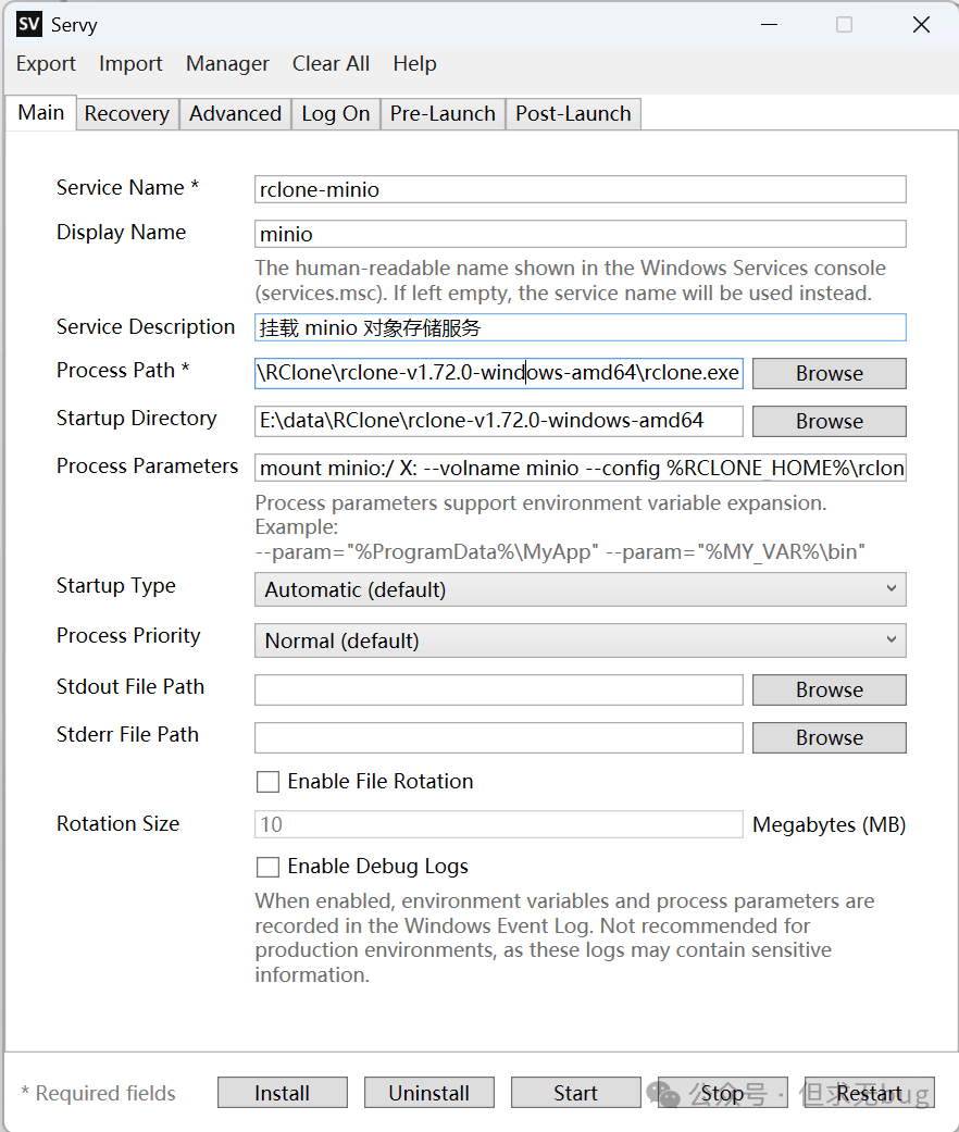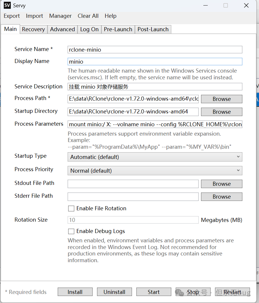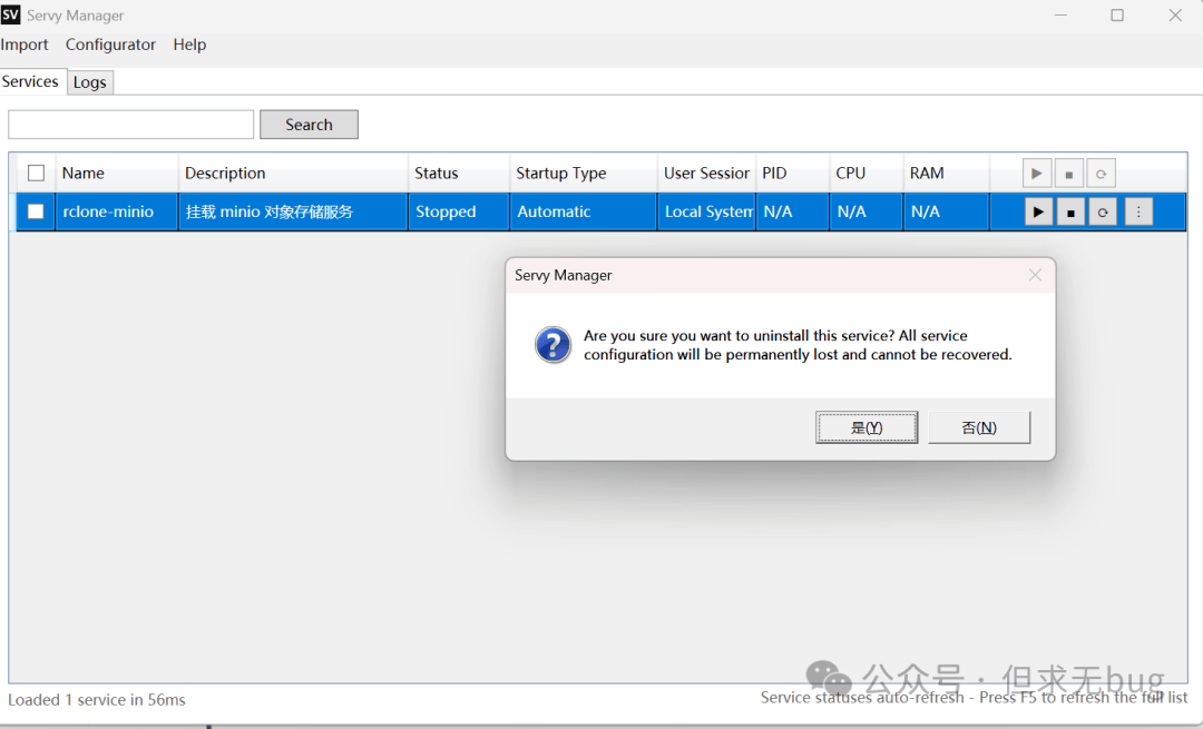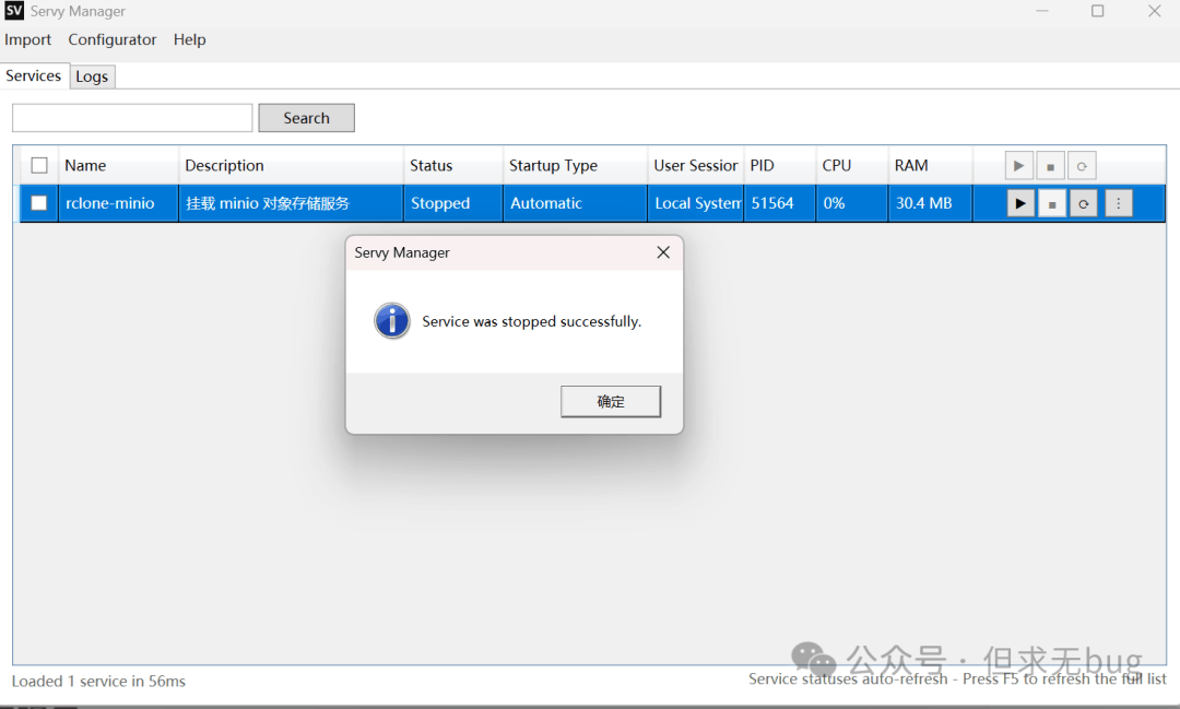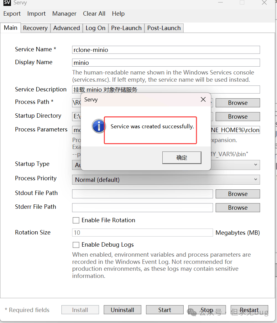![]() 下面还是以使用 RClone 挂载 minio 为例进行演示。 注册服务需用到 Servy 程序,其主界面如下所示: 各项参数的含义为: Service Name: Display Name: Service Description: Process Path: Startup Directory: Process Parameter: Startup Type: Process Priority: Stdout File Path: Stderr File Path: 在 Servy 中填写 RClone 挂载程序的结果如下所示: 可能有些会好奇,在 Process Parameters 中的 %RCLONE_HOME% 的作用,其实这只是引用我在 环境变量中设置的变量而已。该变量在 “Advanced”中进行了设置: 接着点击“Install” 进行安装,安装成功后会弹出如下提示信息 此时在打开的 Servy Manager 中按 F5 键刷新便能看到注册的 rclone-minio 服务: 此时打开 Windows 服务列表,发现已出现了 minio 服务: 在 Servy Manager 面板中点击对应服务的启动按钮即可进行启动: 点击后弹出如下启动成功的信息,且服务的状态也已由 “Stopped”变成了 “Running”: 此时在文件资源管理界面便能看到挂载的 minio : 关闭服务只需在 Servy Manager 管理页面点击如下关闭按钮即可 点击关闭按钮后,会弹出服务关闭信息,且该服务的状态也由“Running” 变成了 “Stopped”: 此时查看文件资源管理器,也发现挂载的磁盘已消失。 编辑服务只需在Servy Manager 管理页面中选择右侧的详情按钮,然后点击“Open Configuration”: 点击后便会弹出如下编辑窗口: 当然,刚确切说是填充了服务信息的创建窗口。编辑完毕后点击 “Install”再次安装即可。 卸载服务是在 Servy Manage 管理页面选择对应服务右侧的详情按钮后,点击“uninstall”便可进行卸载: 点击后会弹出卸载确认信息: 继续点击“是”便完成了卸载: 阅读原文:https://mp.weixin.qq.com/s/n2sgHYLBFnMmu4nXv9UCjg 该文章在 2026/1/20 10:58:27 编辑过 |