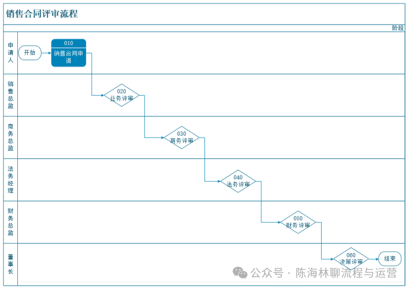 销售合同评审流程图 第二步:收集——多视角还原真相 不要只听一个人说: 现场观察:跟踪实际作业 跨部门工作坊:与执行者、上下游、管理者开展跨部门工作坊 分析文档:查阅现有制度、表格、系统记录 收集数据:获取各环节耗时、错误率等 关键:记录“实际怎么做”,而非“应该怎么做”。 第三步:绘制——从宏观到微观分层展开 顶层图(价值链层级):展示端到端核心环节,用于战略对齐 中间图(部门层级):呈现跨部门活动流,用于分析优化 末端图(操作层级):细化到具体动作,用于培训与执行 绘制技巧: 流向从左到右或从上到下 判断点(菱形)放置于关键分支处 用角色区分业务步骤权责 保持布局疏密有度,避免过于拥挤 第四步:验证——确保准确与可用 召集相关角色进行评审会议; 流程试运行,监视运行状况; 收集一线使用者的反馈意见; 建立定期更新机制,流程变则流程图变。 四、进阶:让流程图真正驱动管理 技巧一:泳道图——厘清权责 何时用:流程涉及多部门/多角色协作。 怎么画:纵向划分泳道代表部门/角色,横向表示步骤顺序。 价值:一眼看清“谁在什么时候,做什么”,杜绝责任真空。