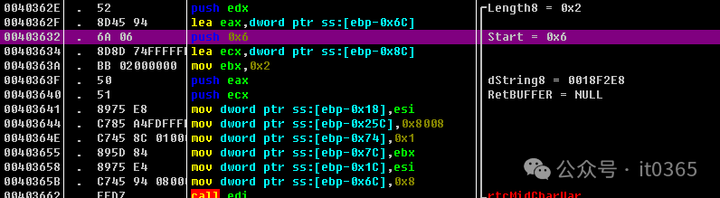 到CALL位置,看到堆栈中的调用参数。反汇编代码中看到,它是从字符串中第6位开始取2位