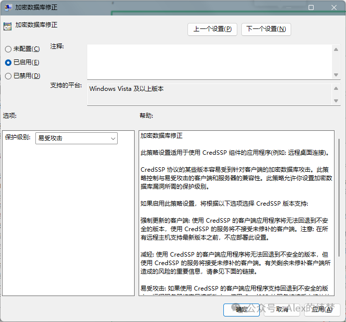 该方法无需触碰远程主机,仅在本地操作,是最推荐的临时方案,适合有组策略功能的系统:按下「Win+R」组合键打开运行窗口,输入 gpedit.msc依次导航路径:计算机配置→管理模板→系统→凭据分配→加密Oracle修正;双击“加密Oracle修正”策略,选择「已启用」,在“保护级别”下拉框中设置为「易受攻击」;