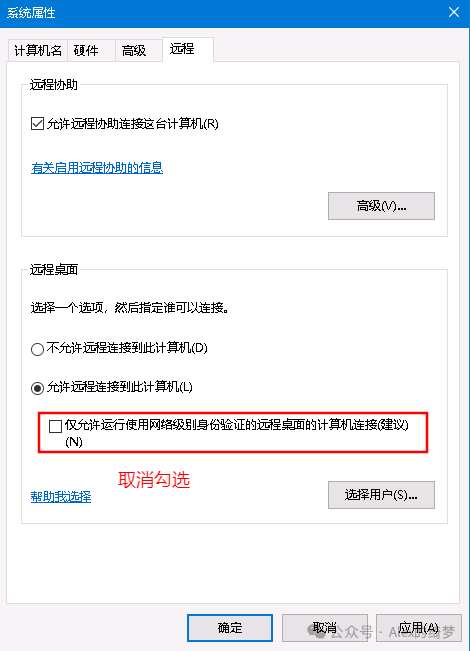 若无法修改客户端设置(如公用电脑),可通过物理接触远程主机,或借助其他远程工具(如AnyDesk)先登录主机,调整网络级别身份验证(NLA)设置:在远程主机上,右键「此电脑」→ 属性 → 点击左侧「远程设置」(或直接运行 sysdm.cpl 快速打开);在「远程桌面」栏目下,勾选「允许运行任意版本远程桌面的计算机连接」(默认可能是“仅允许带NLA的连接”,降低安全要求以兼容);点击「确定」保存,客户端即可通过常规远程桌面连接该主机。