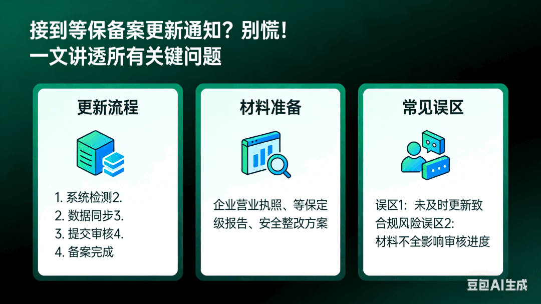 不是只有接到通知才需要更,出现以下情况都要主动启动更新流程:2025年1月1日前已备案的系统(按新规要求统一重新备案更新,有效期自2025年1月1日起重新计算);系统发生重大变化:比如业务范围扩展、用户规模激增(如三级系统用户数突破1万)、核心服务器/数据库迁移、数据类型新增敏感数据(如医疗病历、支付信息);备案信息变更:企业名称、统一社会信用代码、网络安全责任部门/责任人变更;备案证明有效期到期:备案证明有效期为3年,期满前3个月需申请延期更新,完成测评后可自动续期1年;属地监管部门要求:部分地区(如湖北、广东)会定期组织备案信息核查,需按要求补充更新材料。