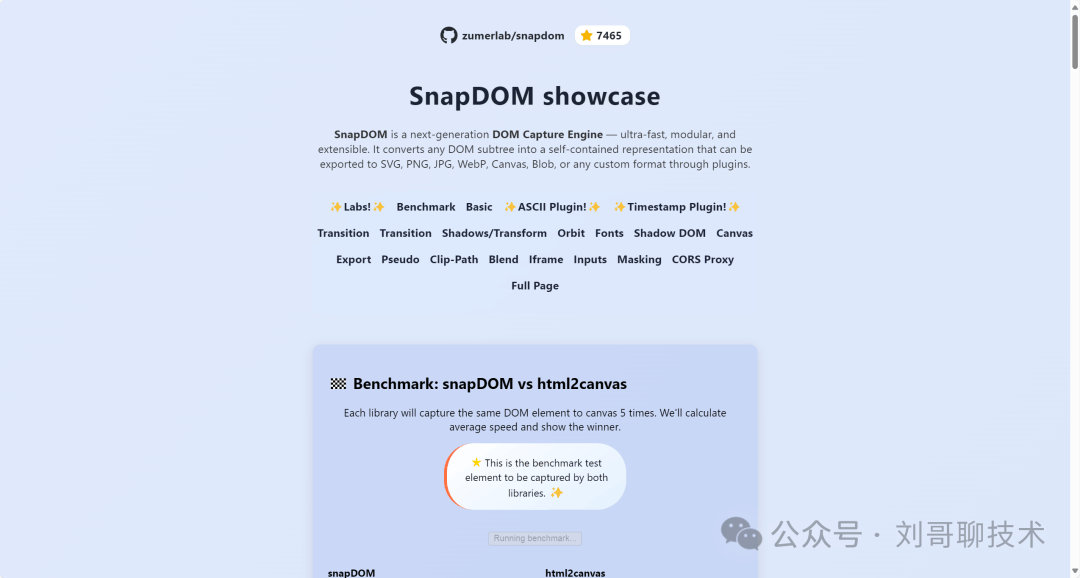 超快速度 - 根据基准测试,在处理复杂元素时,SnapDOM 的性能远超 html2canvas 和其他同类库。简单元素捕获只需 0.5 毫秒,即使是超大尺寸的复杂页面,也只需要 171 毫秒左右。