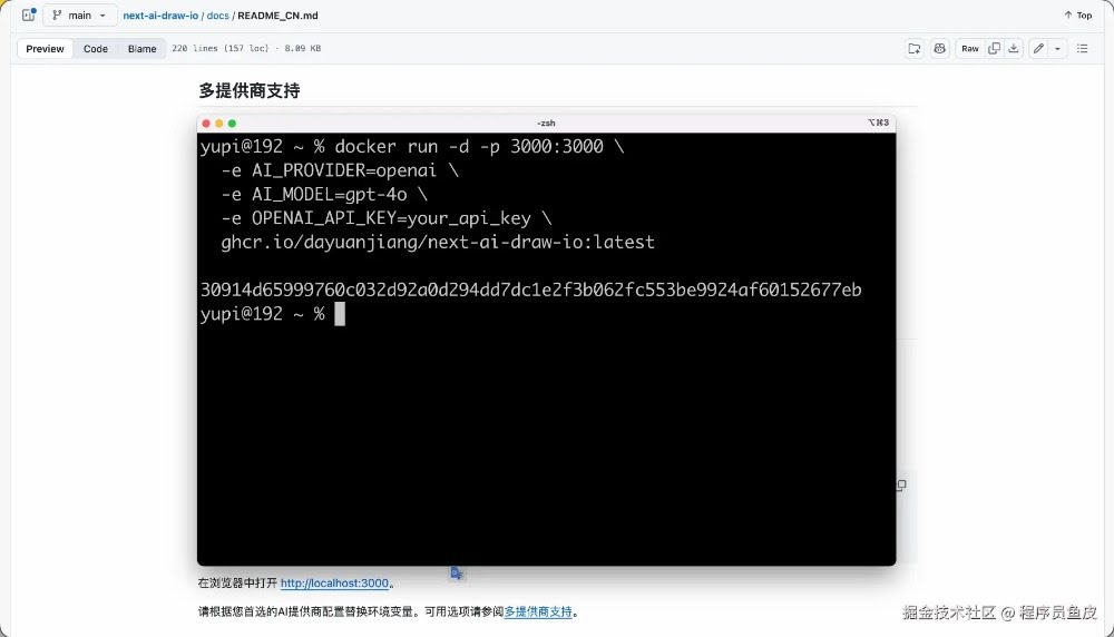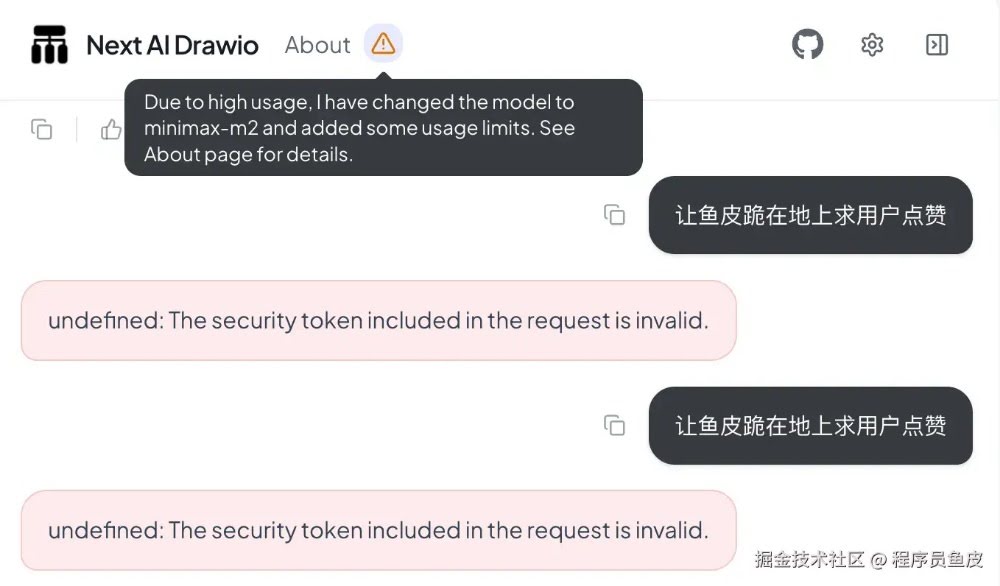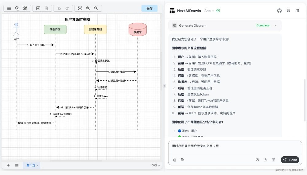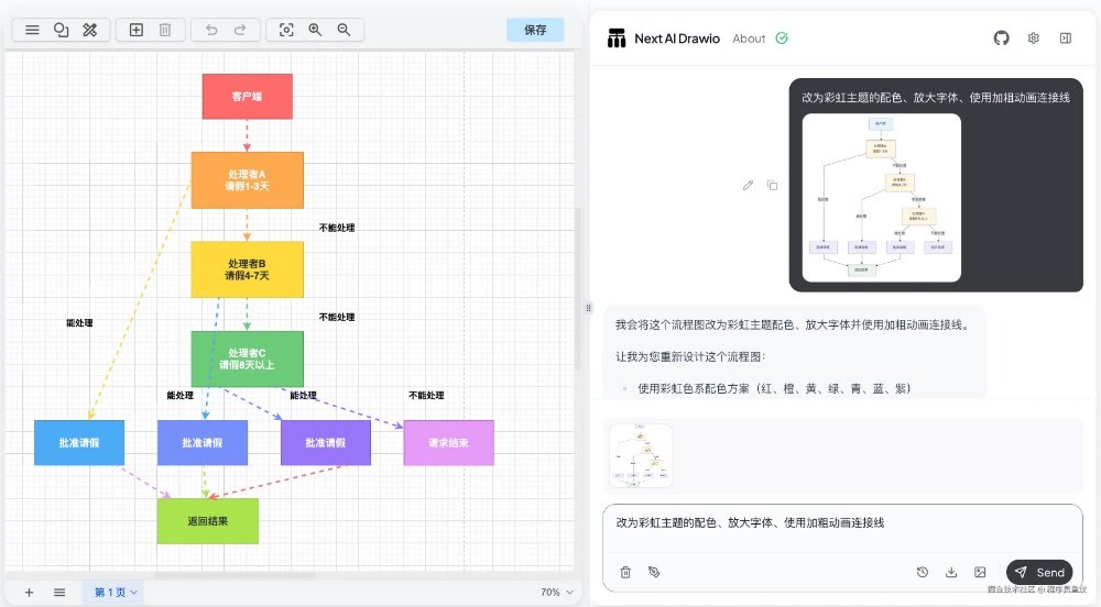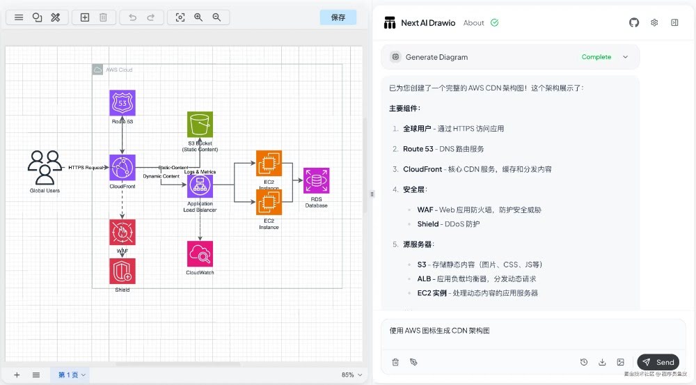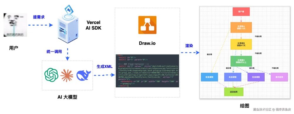 最后多说两句,这个项目的实现其实并不复杂。作者通过集成 Vercel AI SDK 轻松对接各种大模型,让 AI 生成 draw.io 能理解的 XML 代码。 然后直接使用开源的 draw.io 代码实现了核心的绘图展示和编辑能力,整个过程和 AI 生成网站是类似的。