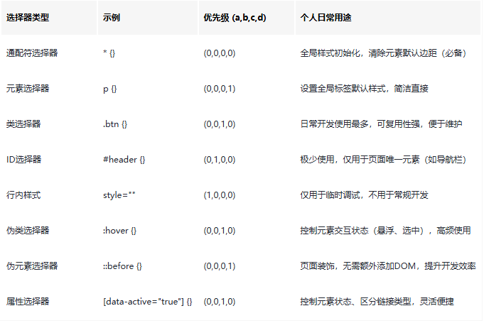 选择器与优先级:为啥我的样式不生效?(附个人踩坑分享)刚开始写CSS时,我经常被“样式不生效”困扰,明明代码逻辑没问题,页面却毫无反应,排查许久才发现根源。 总结下来,90%的问题集中在两点:要么选择器未精准匹配目标元素,要么优先级被其他样式覆盖。今天就把我整理的选择器与优先级干货、踩坑经验分享给大家,帮大家少走弯路,快速排查样式问题。 一、基础选择器:入门必备4种,避坑优先属性选择器小技巧:分享一个实用的符号记忆方法,掌握这几个就能满足日常开发—— ^ 匹配属性值开头、$ 匹配属性值结尾、* 匹配属性值包含指定字符、~ 匹配空格分隔的单词、| 匹配连字符前缀。我平时做表单状态控制、链接类型区分时,经常用到这些,亲测实用且不易踩坑。二、组合选择器:精准定位,告别无效匹配(个人踩坑总结)后代 vs 子选择器:我曾混淆的关键点:刚开始使用时,我经常混淆这两种选择器,踩过几次坑后才彻底分清。 现在我会根据层级需求选择:层级较深时用后代选择器,对结构层级有严格要求时用子选择器,避免多余匹配浪费性能。 三、伪类选择器:控制元素状态,提升交互体验(日常开发高频使用)nth-child 公式:个人常用简化版本:核心语法是 新手踩坑点:我曾栽过的关键错误:重点提醒大家,nth-child是按父元素所有子元素计数,并非仅统计同一种类型的元素!比如父元素包含p、span、p三个子元素, 四、伪元素选择器:装饰元素神器,无需额外添加DOM(个人常用技巧)代码高亮: /* ::before / ::after 注意事项:必须添加content属性,否则无法显示 */ .quote::before { content: """"; font-size: 2em; color: #ccc; } .quote::after { content: """ "; } /* 首行、首字母伪元素:优化文本排版,提升页面格调 */ p::first-line { font-weight: bold; } /* 文本第一行,突出重点内容 */ p::first-letter { font-size: 2em; float: left; margin-right: 4px; } /* 首字母放大,优化排版 */ /* 选中文本伪元素:自定义选中文本样式,替代浏览器默认样式 */ ::selection { background: #b3d4fc; color: #000; } /* 占位符伪元素:统一占位符颜色,保持页面风格一致 */ input::placeholder { color: #999; } 伪元素关键提醒:个人总结3点核心:掌握这3点,基本不会踩坑!1. CSS3规范中,伪元素使用双冒号 五、优先级计算:样式生效的核心(个人踩坑最多的部分)样式能否生效,核心取决于优先级高低!刚开始我始终搞不懂优先级逻辑,写的样式经常被覆盖。 后来总结出一套简单易懂的计算方法:按 (a, b, c, d) 四位数值计算,高位优先对比,无需累加求和,高位数值越大,样式优先级越高,越容易生效。分享我日常记忆的规则: