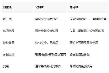所有IPv4地址按用途可分为公网IP和内网IP,这是开发中最常接触的分类方式: