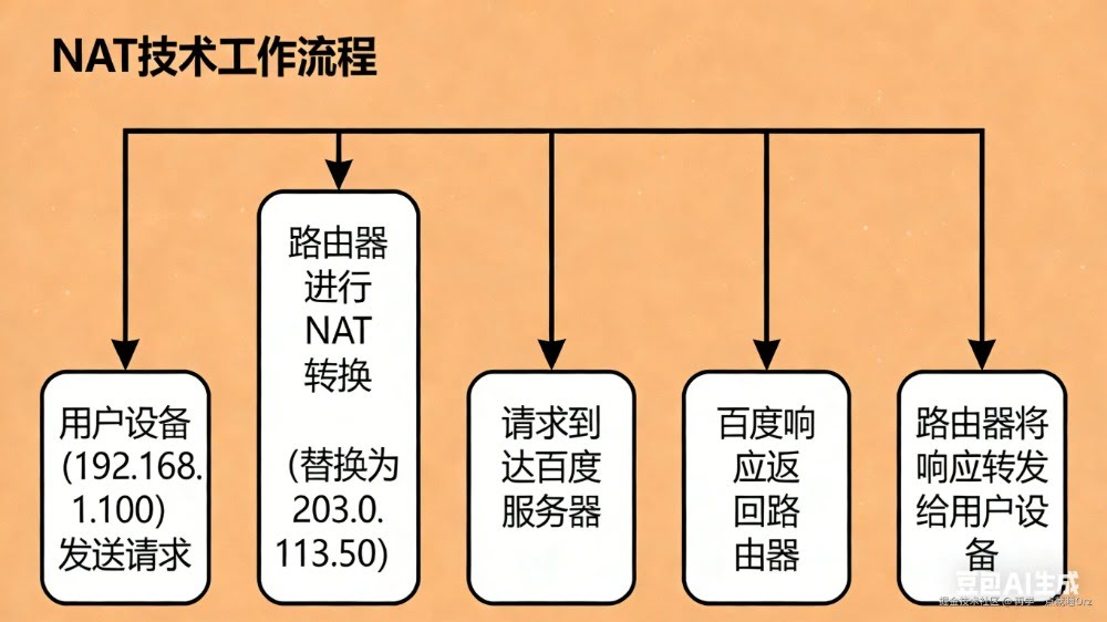 路由器NAT转换:将内网IP替换为公用IP → 203.0.113.50 → “我要访问百度”