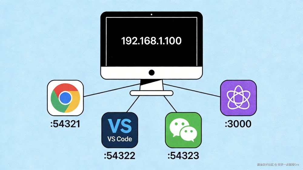 - VS Code: 192.168.1.100:54322 (系统随机端口)