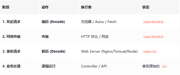 关键结论: 后端框架(Spring Boot, Express, Django 等)在将请求交给你的业务代码(Controller)之前,通常已经自动完成了 URL 解码。 如果你在数据库里存入了这个值,存进去的是 5. 前端开发实战指南在 JS 中手动处理 URL 编码时,请务必区分这两个 API: