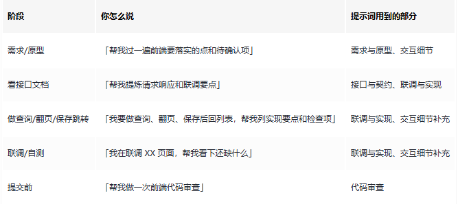 覆盖需求与原型、交互细节、接口理解与联调、查询/翻页/保存后跳转等实现要点及代码审查。使用时复制「完整提示词」到对话中,再说明当前阶段或具体问题即可。