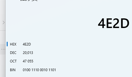 "中"这个字符的码点为U+4E2D,在U+0800~U+FFFF范围内,占用 3 字节。 - 十六进制转换成二进制