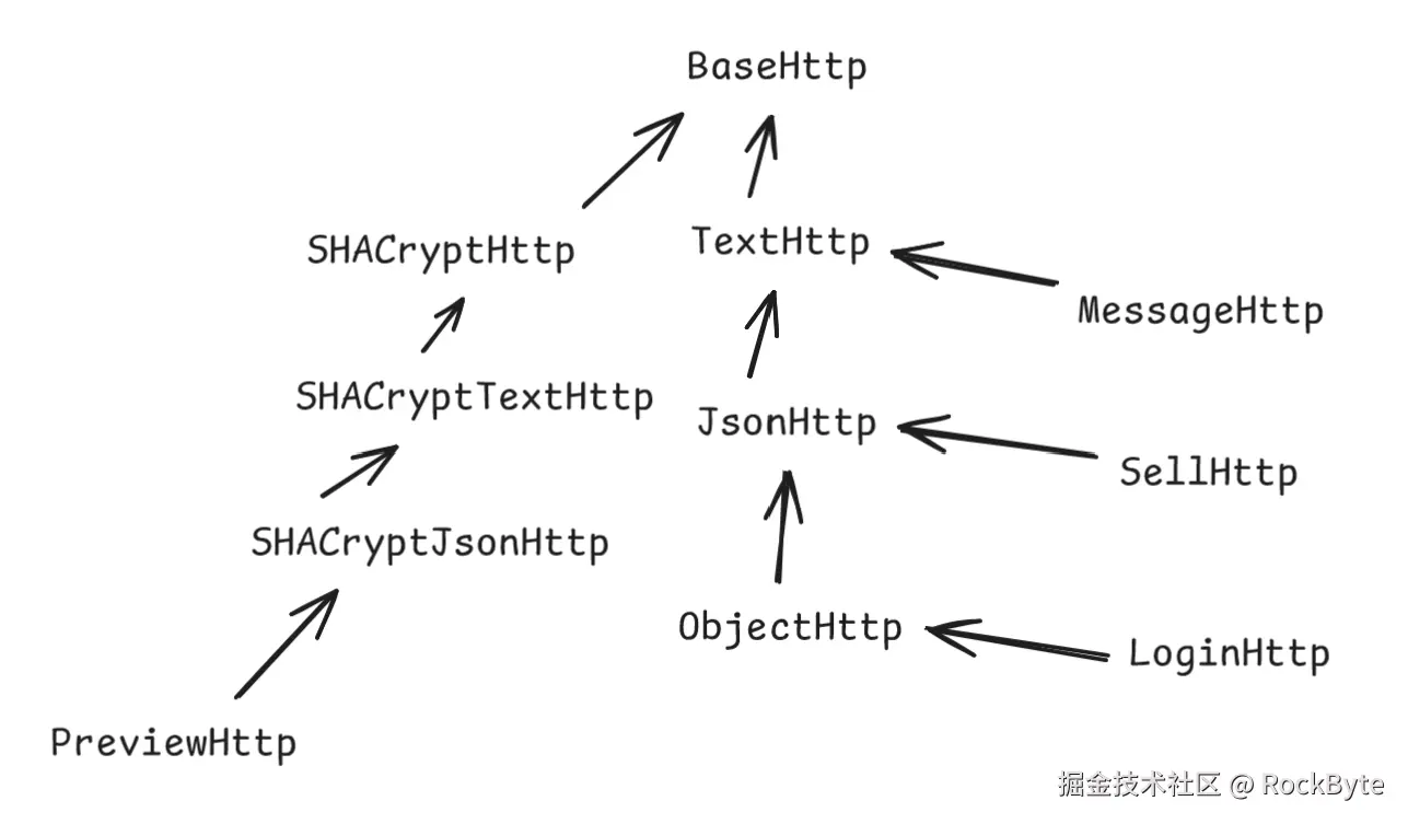 而使用这个网络库的人,只需要按照 API 文档中的 API 名称,用这个请求就行了,例如 但是后续改动,让我越来越 Hold 不住这种继承链了:有的 API 需要鉴权,有的不需要;部分 API 会有不同的 Header;有的 API 返回结果加密方式和之前的不一样。 慢慢的,我发现我的继承链越来越长,为了让我的 API 使用保持简洁,甚至出现了类似菱形继承的情况(这里不是说 Java 可以菱形继承):