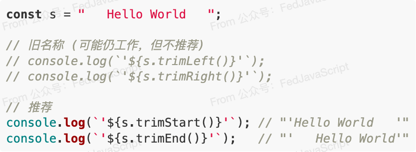 这两个方法用于移除字符串开头或结尾的空白字符。它们已被ECMAScript标准采纳,但名称更改为 trimStart() 和 trimEnd() 以获得更好的语义一致性(与 padStart() 和 padEnd() 等方法对齐)。虽然旧名称在很多浏览器中仍可作为别名使用,但推荐使用标准名称。