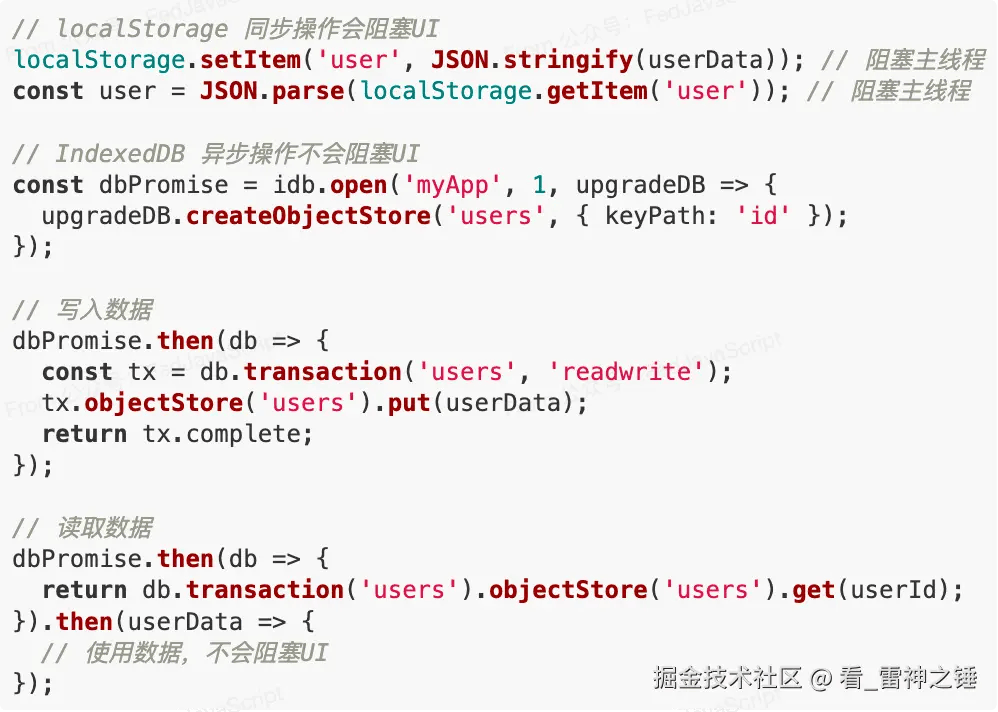 IndexedDB:现代前端存储的王者IndexedDB 是一个面向对象的数据库系统,专为大量结构化数据的客户端存储而设计。它解决了 localStorage 的所有核心痛点,并提供了更多高级功能: 1. 异步操作,性能更优与 localStorage 的同步操作不同,IndexedDB 采用异步 API,所有操作都不会阻塞主线程: