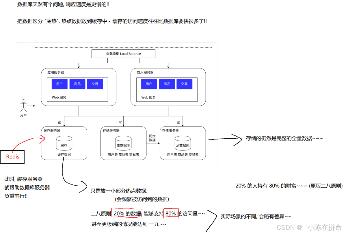 应用中需要对读写请求做分离处理,所以可以利用⼀些数据库中间件,将请求分离的职责托管出去。 相关软件:MyCat、TDDL、Amoeba、Cobar等类似数据库中间件等 2.7 引入缓存-冷热分离架构随着访问量继续增加,发现业务中⼀些数据的读取频率远大于其他数据的读取频率。我们把这部分数据称为热点数据,与之相对应的是冷数据。 针对热数据,为了提升其读取的响应时间,可以增加本地缓存,并在外部增加分布式缓存,缓存热⻔商品信息或热⻔商品的html⻚⾯等。通过缓存能把绝大多数请求在读写数据库前拦截掉,⼤大降低数据库压力。其中涉及的技术包括:使用memcached作为本地缓存,使用Redis作为分布式缓存,还会涉及缓存⼀致性、缓存穿透/击穿、缓存雪崩、热点数据集中失效等问题。