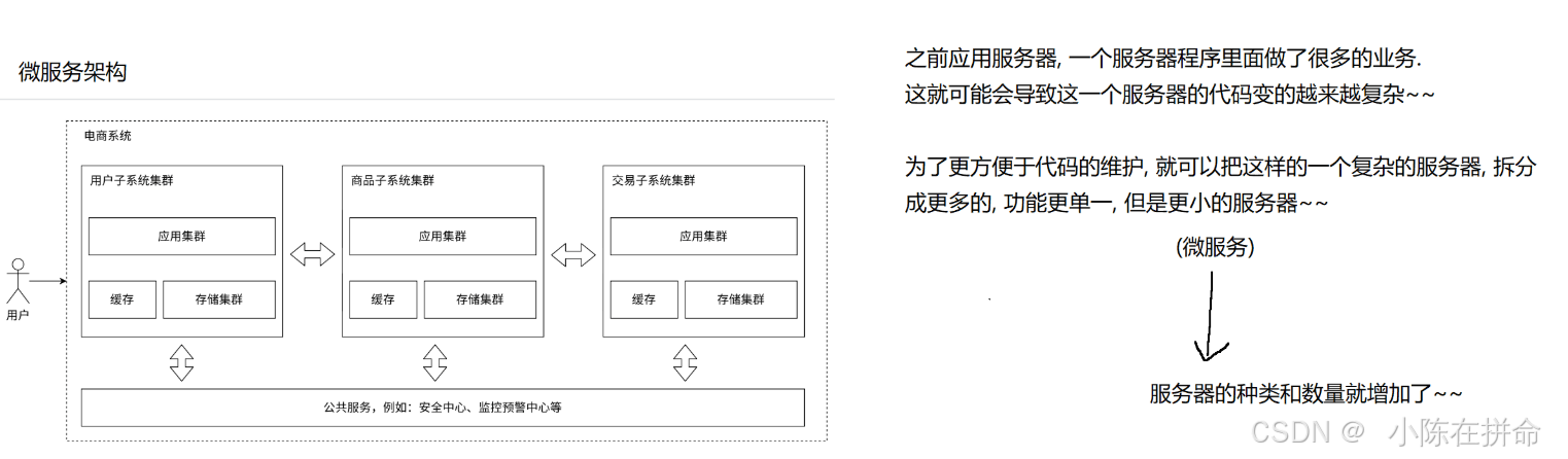 问题:引入微服务解决了人的问题,但是付出的代价是什么呢?? 1、系统性能下降。因为本来各个模块的相互调用只需要通过进程内部就可以完成,但是现在拆分出来的各个模块就必须依赖网络通信,网络通信的速度可能是比硬盘还慢的(幸运的是硬件技术的发展,现在网卡有万兆网卡,读写速度已经超过了硬盘读写了,但是会比较贵),所以要想保证不下降太多,只能花钱引入更多的机器和硬件资源。 2、系统复杂程度提高,可用性受到影响 。因为服务器更多以为着出问题的概率更大,因此着着就需要有一系列的手段来保证系统的可用性(更丰富的监控报警,以及配套的运维人员) 微服务的优势: 1、解决了人的问题 2、减少重复代码,提供功能的复用性。) 3、高度解耦: 每个服务都是独立的,可以独立开发、部署和扩展(硬件资源的综合调配),提高了系统的可维护性和可扩展性。 4、快速迭代: 服务可以根据需求快速更新和迭代,更容易适应业务变化。 5、资源隔离,互不影响,对调用方隐藏内部细节。 三、分布式系统总结1、单机架构(应用程序+服务器) 2、数据库和应用分离:应用程序和数据库服务器可以分别放到不同主机上进行部署,这样有利于我们更好地调整硬件结构,提高性价比 3、引入负载均衡,应用服务器成为了一个集群:(1)通过负载均衡器把请求比较均匀地分发给集群中的每个应用服务器。(2)即使集群中的某个主机挂了,其他主机仍然可以承担服务,提高了整个系统的可用性。 4、引入读写分离,数据库主从结构:一个数据节点作为主节点,其他N个数据库作为同节点,主节点负责写数据,从节点负责读数据, 同时主节点还需要把修改过的数据同步给从节点。 5、引入缓存,冷热数据分离:(根据二八原则)进一步提高服务器针对请求的处理能力,redis在分布式系统中,通常扮演着缓存这样的角色 ,用来存储热点数据。 付出的代价就是数据库和缓存的数据一致性问题需要解决! 6、引入分库分表:让数据库能够进一步扩展存储空间。 7、引入微服务:从业务功能的角度把应用服务器拆分成更多功能更单一、更小的服务器。 付出的代价就是系统的性能会下降,且复杂程度会提高。 上述这些演化步骤,只是一个粗略的过程,实际上一个商业项目的真实演化过程都是和他的业务发展密切相关的,业务决定技术,技术只是用来给业务提供支持的 所谓分布式系统,就是想办法引入更多的硬件资源。 注意,以上所说的架构演变顺序只 是针对某个侧⾯进⾏单独的改进,在实际场景中,可能同⼀时间会有⼏个问题需要解决,或者可能先达到瓶颈的是另外的⽅⾯,这时候就应该按照实际问题实际解决。如在政府类的并发量可能不⼤,但业务可能很丰富的场景,⾼并发就不是重点解决的问题,此时优先需要的可能会是丰富需求的解决⽅案。 对于单次实施并且性能指标明确的系统,架构设计到能够⽀持系统的性能指标要求就足够了,但要留有扩展架构的接⼝以便不备之需。对于不断发展的系统,如电商平台,应设计到能满⾜下⼀阶段 ⽤⼾量和性能指标要求的程度,并根据业务的增⻓不断的迭代升级架构,以⽀持更⾼的并发和更丰富 的业务。 所谓的“⼤数据”其实是海量数据采集清洗转换、数据存储、数据分析、数据服务等场景解决⽅ 案的⼀个统称,在每⼀个场景都包含了多种可选的技术,如数据采集有Flume、Sqoop、Kettle等,数据存储有分布式⽂件系统HDFS、FastDFS,NoSQL数据库HBase、MongoDB等,数据分析有Spark技术栈、机器学习算法等。总的来说⼤数据架构就是根据业务的需求,整合各种⼤数据组件组合⽽成的 架构,⼀般会提供分布式存储、分布式计算、多维分析、数据仓库、机器学习算法等能⼒。⽽服务端架构更多指的是应⽤组织层⾯的架构,底层能力往往是由⼤数据架构来提供。 转自https://blog.csdn.net/weixin_51142926/article/details/145481397 该文章在 2026/2/6 10:20:59 编辑过 |