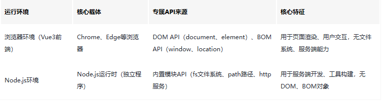 二、为什么有些npm包适配Vue3,有些只适配Node.js?这个问题的核心答案的是:npm包的适用场景,由它所依赖的“运行环境API”决定。Vue3项目和Node.js的运行环境完全不同,二者支持的底层API不互通,这就导致了包的兼容性差异。 首先我们明确两个核心运行环境的区别: 需要特别注意:Vue3项目并非完全脱离Node.js——开发和构建阶段(比如运行npm run dev、npm run build),Vue3的配置文件(如vite.config.ts、vue.config.js)是运行在Node.js环境中的;