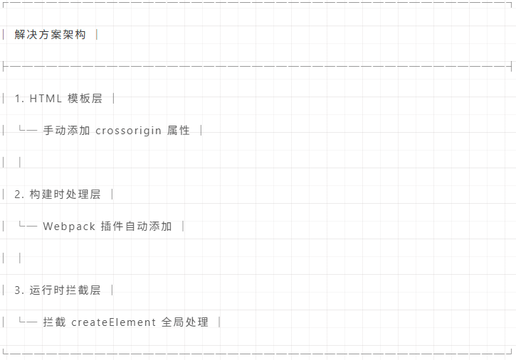 如果该标签没有 只有当 与此同时,服务器/CDN 响应也必须包含正确的 CORS 相关头部,如 这是因为浏览器在跨域加载资源时,会先根据标签属性判断是否允许访问细节,再检查服务器是不是“回应放行”了该跨域请求。如果服务器未设置这些头部,哪怕你加了 如果缺少其中任何一个,浏览器都会隐藏错误详情。 3. Webpack/Rspack 动态加载机制现代前端构建工具(Webpack、Rspack)在实现代码分割和懒加载时,会通过 如果这些动态创建的标签没有 解决方案我们采用了一套三层防护的解决方案: 方案架构图