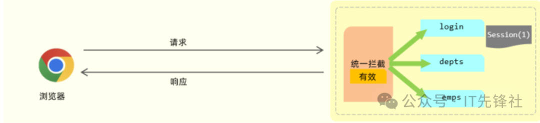 如果我们现在要基于 session 来进行会话跟踪,浏览器在第一次请求服务器的时候,我们就可以直接在服务器当中来获取到会话对象session。如果是第一次请求session,会话对象是不存在的,这个时候服务器会自动的创建一个会话对象session 。而每一个会话对象session ,它都有一个ID(示意图中session后面括号中的1,就表示ID),我们称之为 session 的ID。