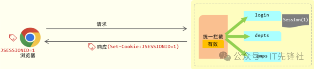 接下来,服务器端在给浏览器响应数据的时候,它会将 session 的 ID 通过cookie 响应给浏览器。其实在响应头当中增加了一个 set-cookie 响应头。这个 Set-Cookie响应头对应的值是不是cookie? cookie 的名字是固定的 JSESSIONID 代表的服务器端会话对象Session 的 ID。浏览器会自动识别这个响应头,然后自动将cookie存储在浏览器本地。