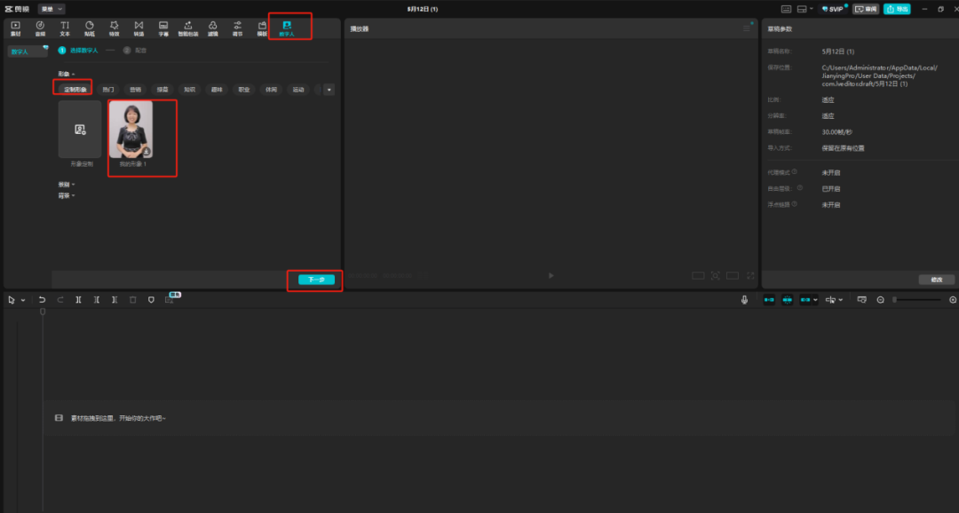 点击顶部菜单【数字人】→ 从定制形象中选择定制的形象→ 点击【下一步】