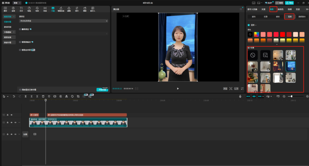 在【画面】→【背景】选项添加喜欢的场景,即可更换数字人视频背景。