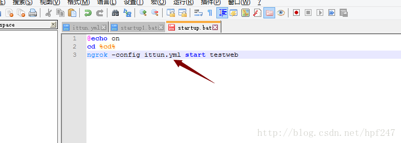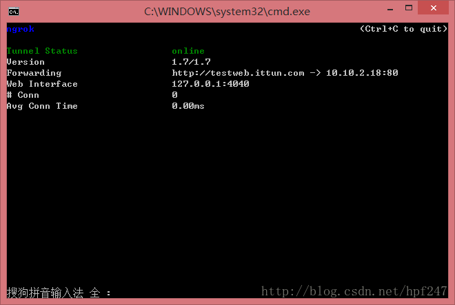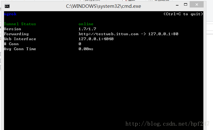 双击打开startup.bat后会出现下面的终端,下面 http://testweb.ittun.com -> 127.0.0.1:80的意思是将127.0.0.1:80 (即你本机的地址,默认是80端口)映射到 http://testweb.ittun.com